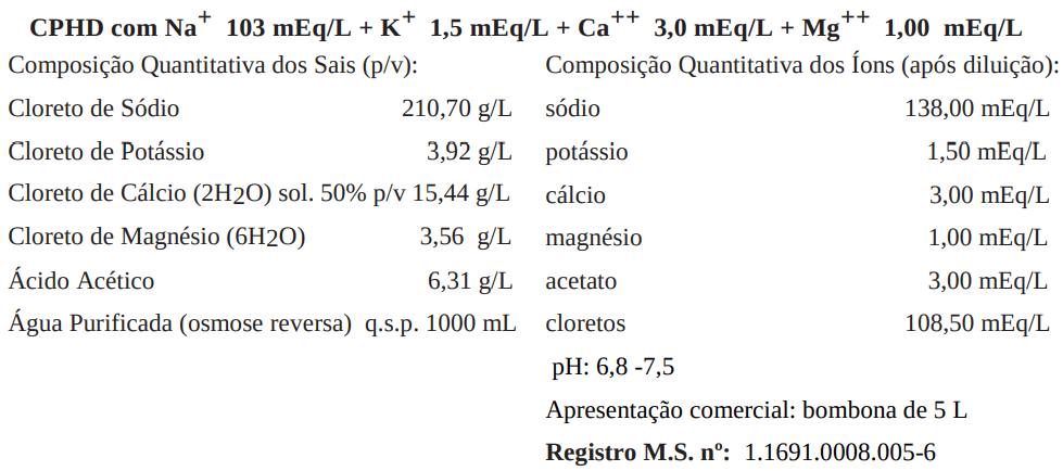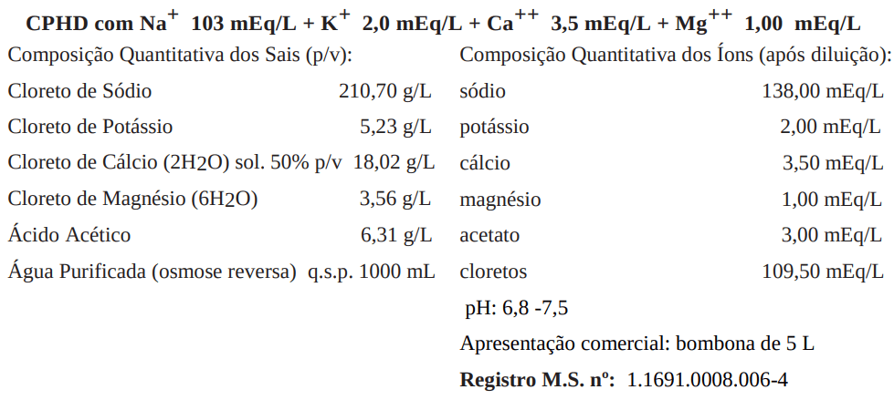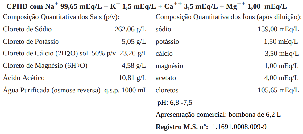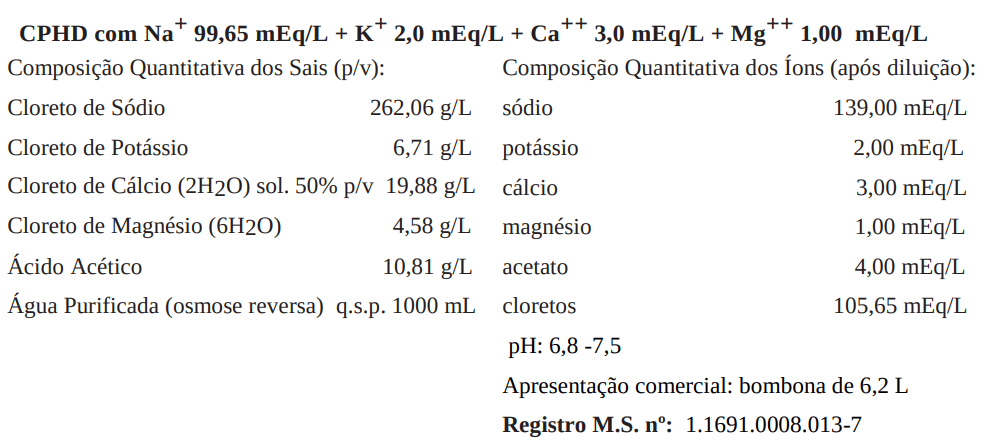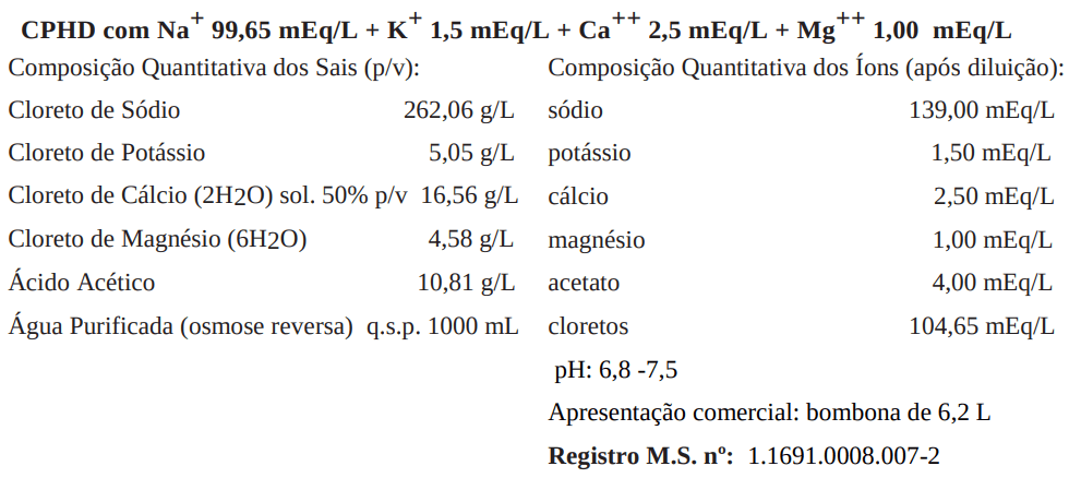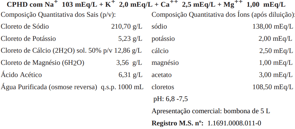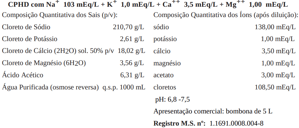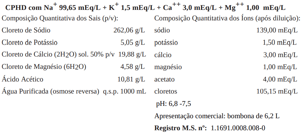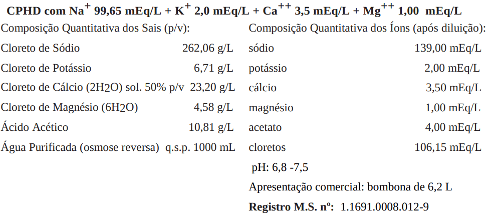 Usar obrigatoriamente em conjunto com solução de Bicarbonato de Sódio 8,4% (CPHD Fração Básica).